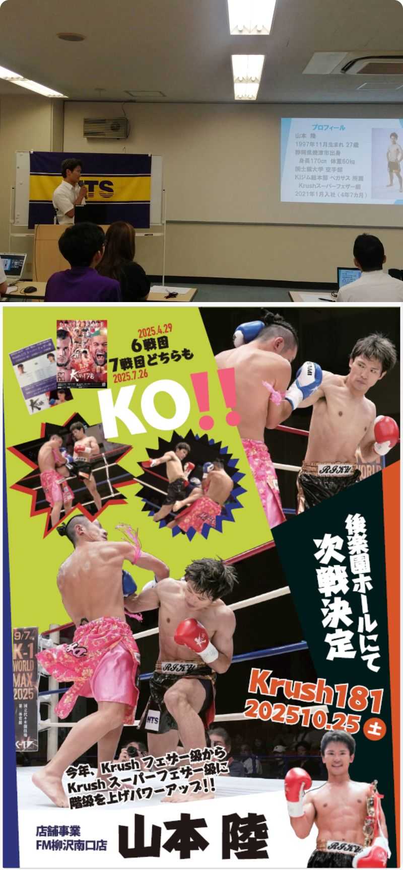 アスリート社員の店舗事業柳沢南口店の山本さんの新しいポスターが出来上がりました。2025年2試合のKO勝ちの勇ましい姿がたっぷりのポスターを各部門で掲示して全社で応援しましょう。